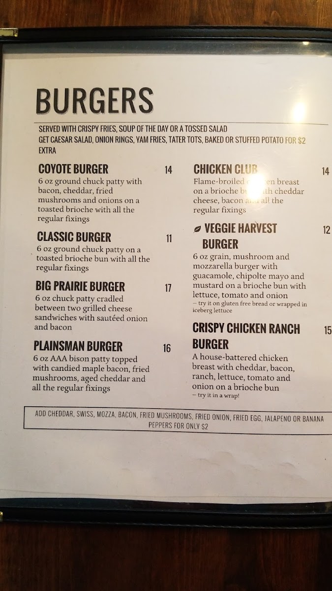 Highlights include hearty burgers like the Big Prairie Burger and the Coyote Burger, alongside crowd-pleasers such as wings with fries, a creamy mushroom soup, and fresh wraps. Each dish complements the laid-back atmosphere, where sharing a cold beer—especially on the sunny deck—feels just right.
